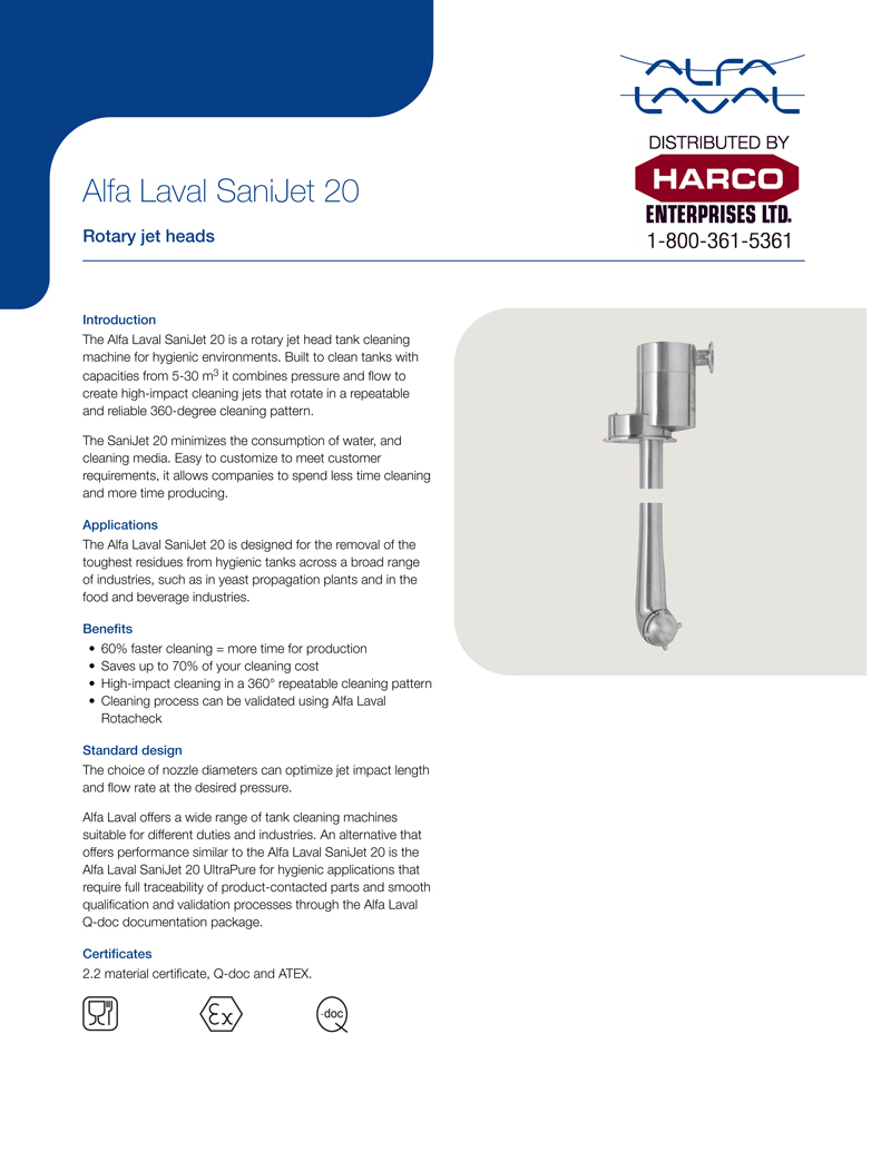 Now available from Harco, the Alfa Laval SaniJet 20 rotary jet heads are a tank cleaning machine specifically designed for hygienic environments. Built to efficiently clean tanks with capacities ranging from 5 to 30 m³, it combines pressure and flow to generate high-impact cleaning jets that rotate in a reliable, repeatable 360-degree pattern.
