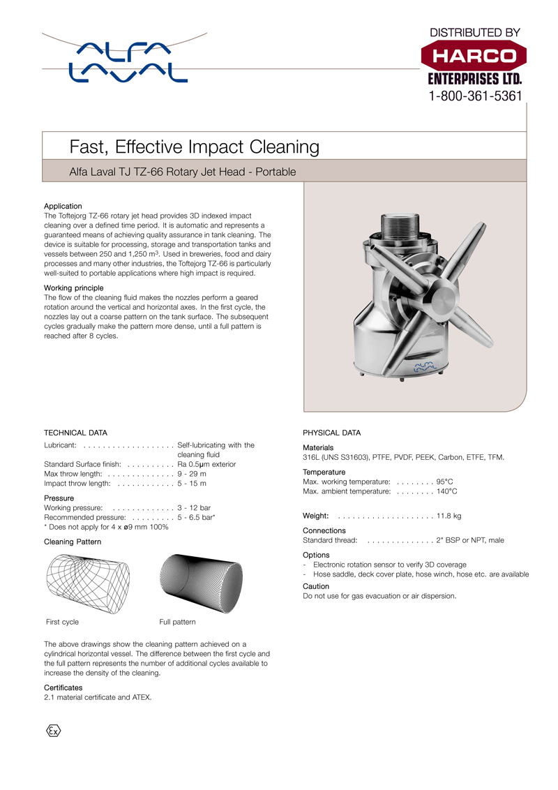 Now available from Harco, the Alfa Laval Toftejorg TZ-66 rotary jet heads deliver precise 3D indexed impact cleaning in a fully automatic process. Designed for hygienic tank cleaning, these advanced devices guarantee consistent quality assurance. They are ideal for processing, storage, and transportation tanks from 250 to 1,250 m³.