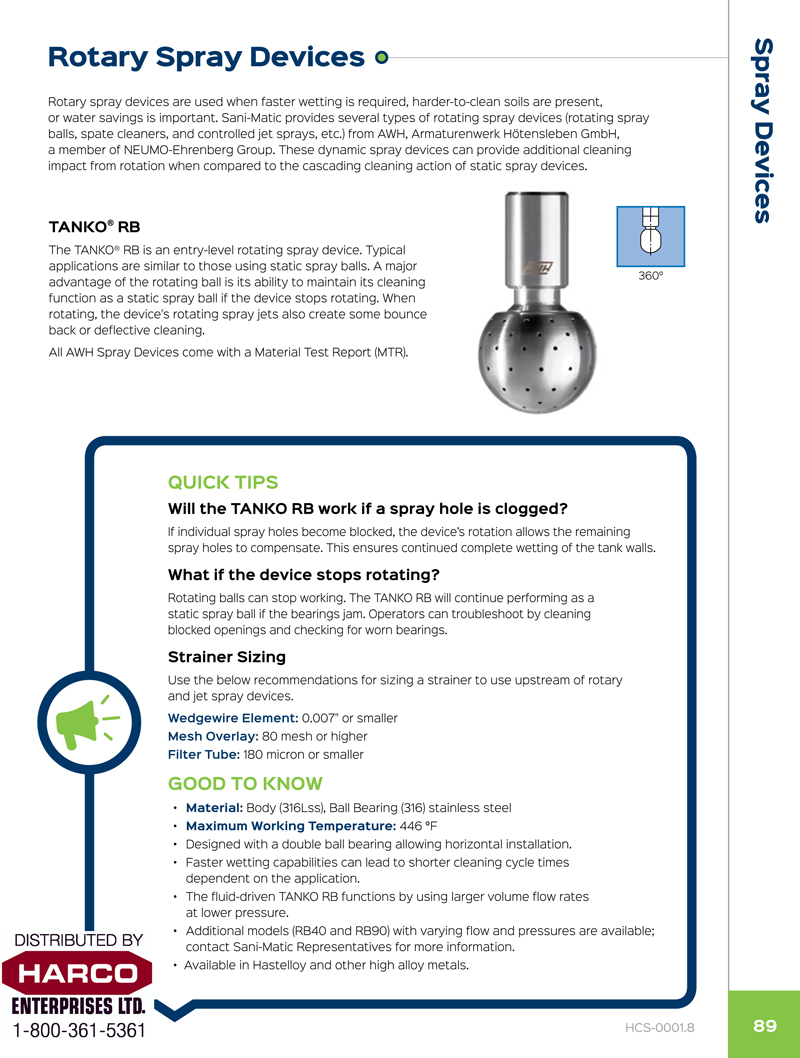 Now available from Harco, the Sani-Matic TANKO® RB Rotary Spray Head by AWH is an entry-level CIP (clean-in-place) rotating spray device, ideal for tank cleaning applications that typically use static spray balls. A key advantage of the Sani-Matic TANKO® RB rotary spray head is its ability to maintain effective cleaning even if rotation stops—functioning like a static spray ball. When rotating, its spray jets provide enhanced cleaning through bounce-back and deflective action.