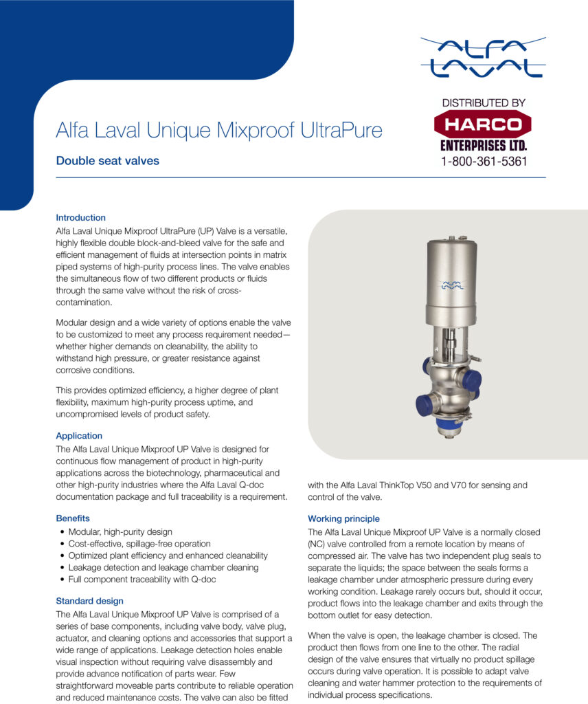 Harco offers the Alfa Laval Unique Mixproof UltraPure Valves, designed to suit the needs of the pharmaceutical and biotech industries. It enables the simultaneous flow of two different fluids without the risk of cross-contamination. Modular in design, they ensure maximum uptime for continuous, high-purity processes.